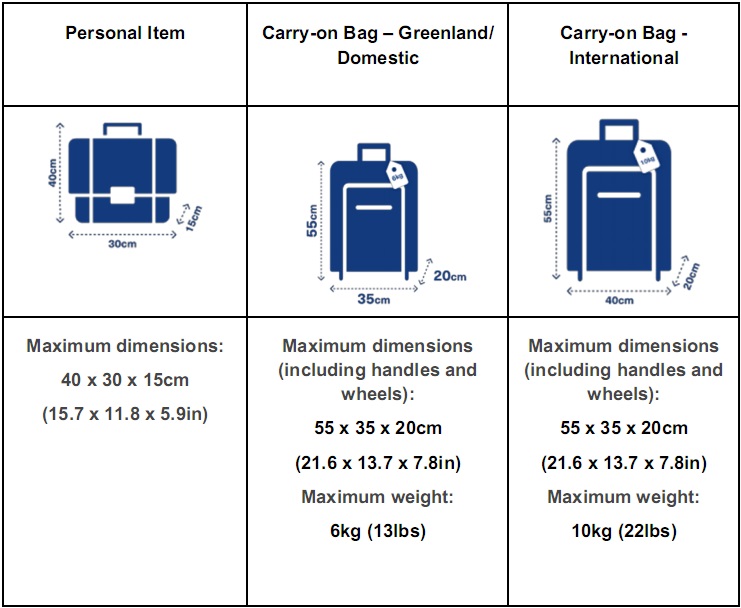 The maximum dimensions and weights of carry-on bags and personal items when traveling Icelandair are shown in the table below: